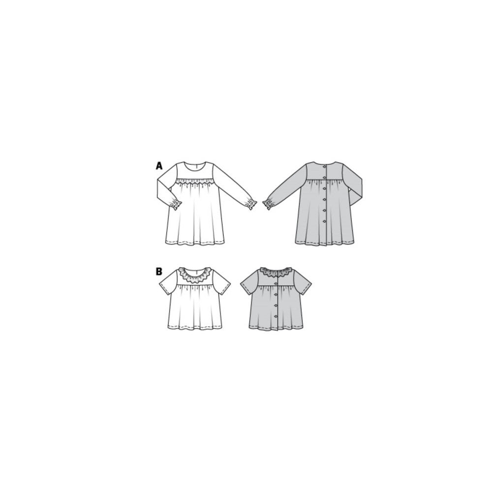 Střih ve velikostech EUR 56-98, úroveň obtížnosti šití: 2 (lehká), doporučené látky: bavlna, směsové látky, len, viskóza