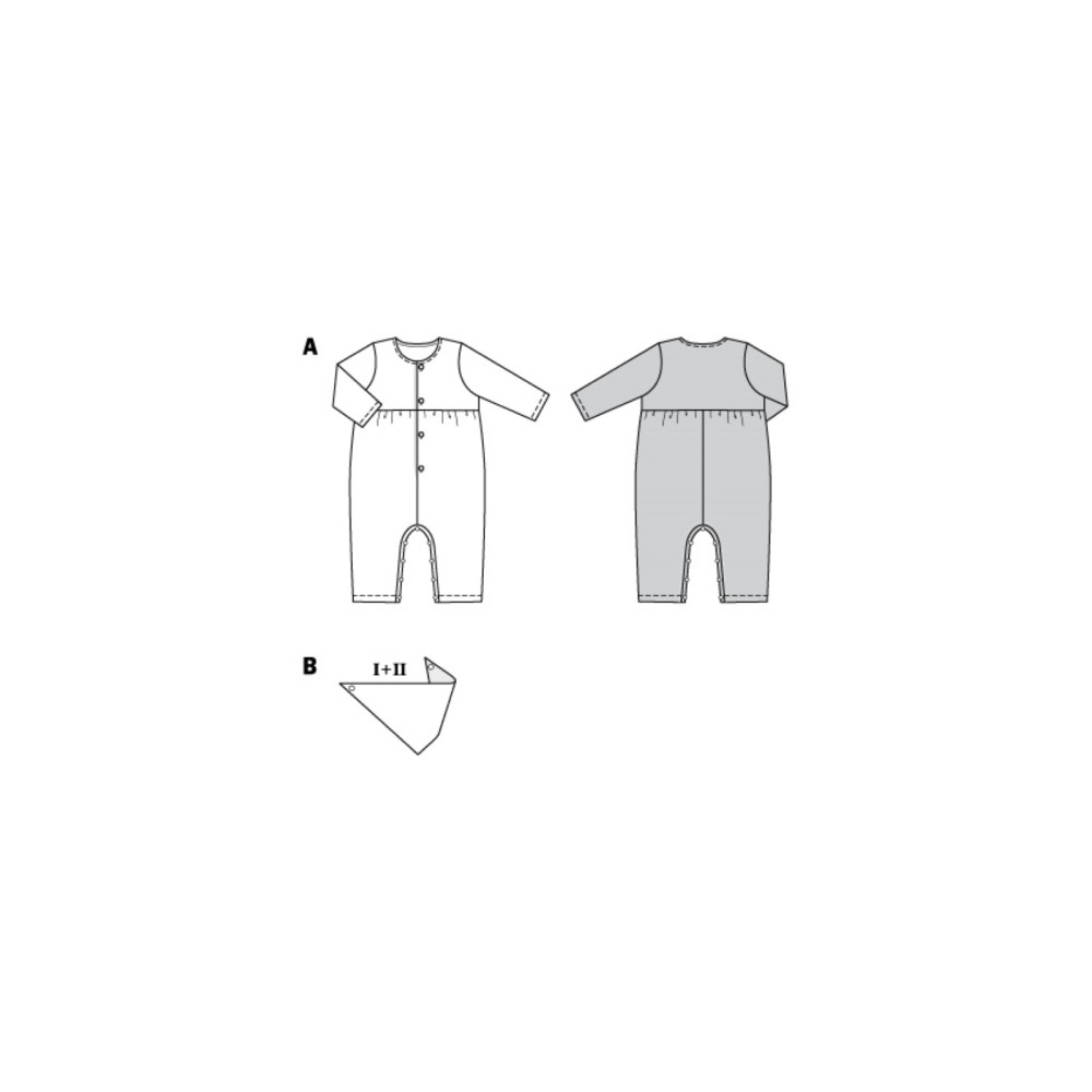 Střih ve velikostech EUR 56-98, úroveň obtížnosti šití: 2 (lehká), doporučené látky: bavlna, velur, mušelín