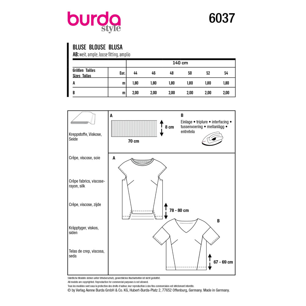 Střih ve velikostech EUR 44-54, úroveň obtížnosti šití: 2 lehká info, doporučené látky: krepové látky, viskóza, hedvábí