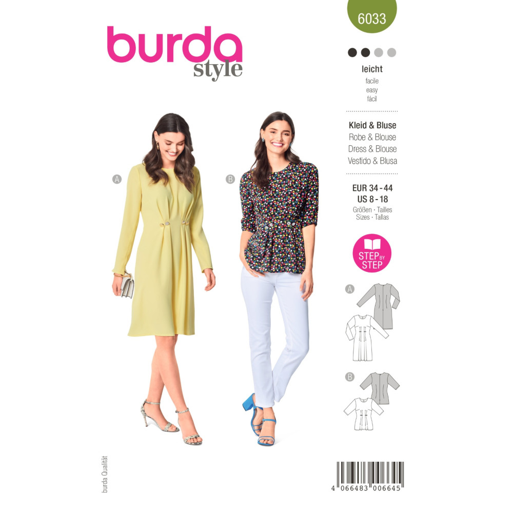 Střih Burda 6033, návod k šití: šaty s knoflíky a řasením, halenka