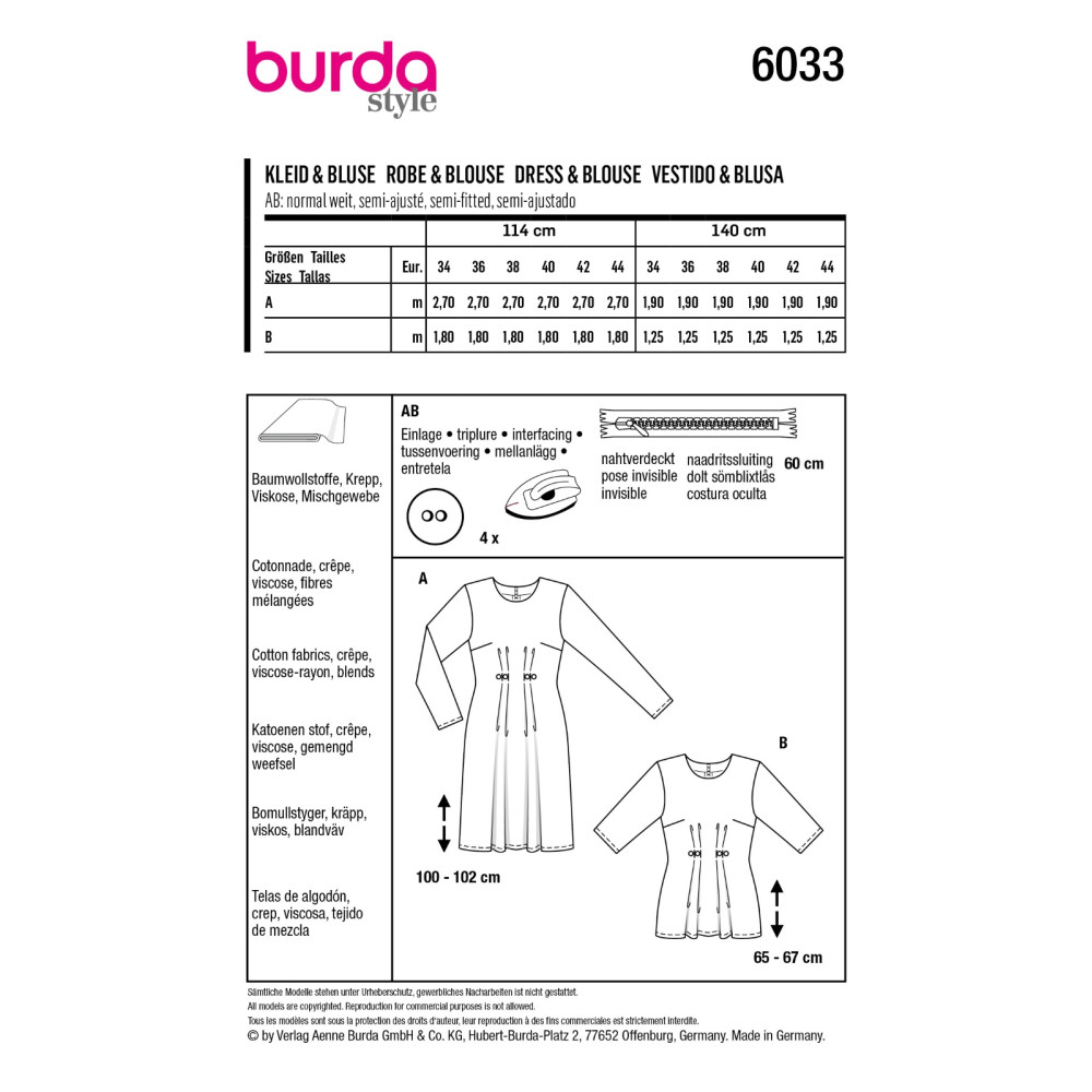 Střih ve velikostech EUR 34-44, úroveň obtížnosti šití: 2 lehká info, doporučené látky: bavlna, krepové látky, viskóza, směsové látky