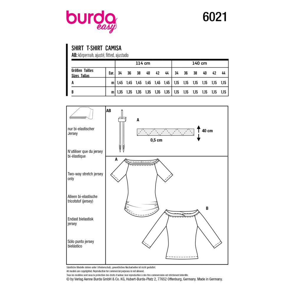 Střih ve velikostech EUR 34-44, úroveň obtížnosti šití: 1 velmi lehká info, doporučené látky: pouze bi-elastický žerzej