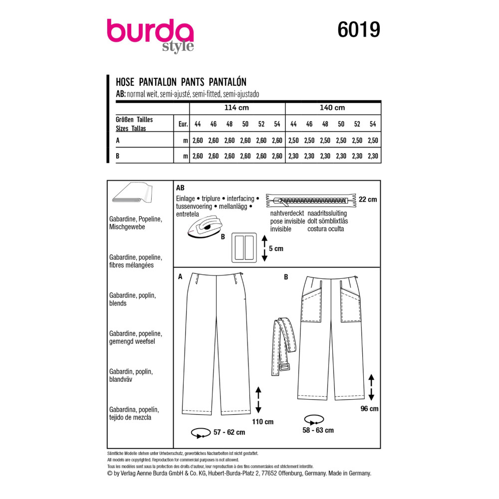 Střih Burda 6019, návod k šití: rovné kalhoty se zipem na boku