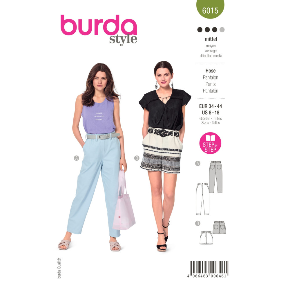 Střih Burda 6015, návod k šití: džíny "mrkváče", džínové šortky