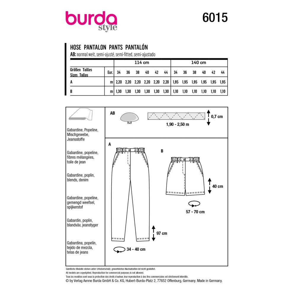 Střih ve velikostech EUR 34-44, úroveň obtížnosti šití: 3 střední info, doporučené látky: gabardén, popelín, směsové látky, džínovina