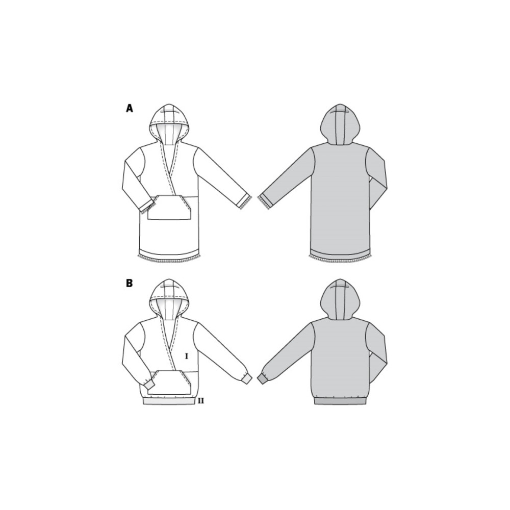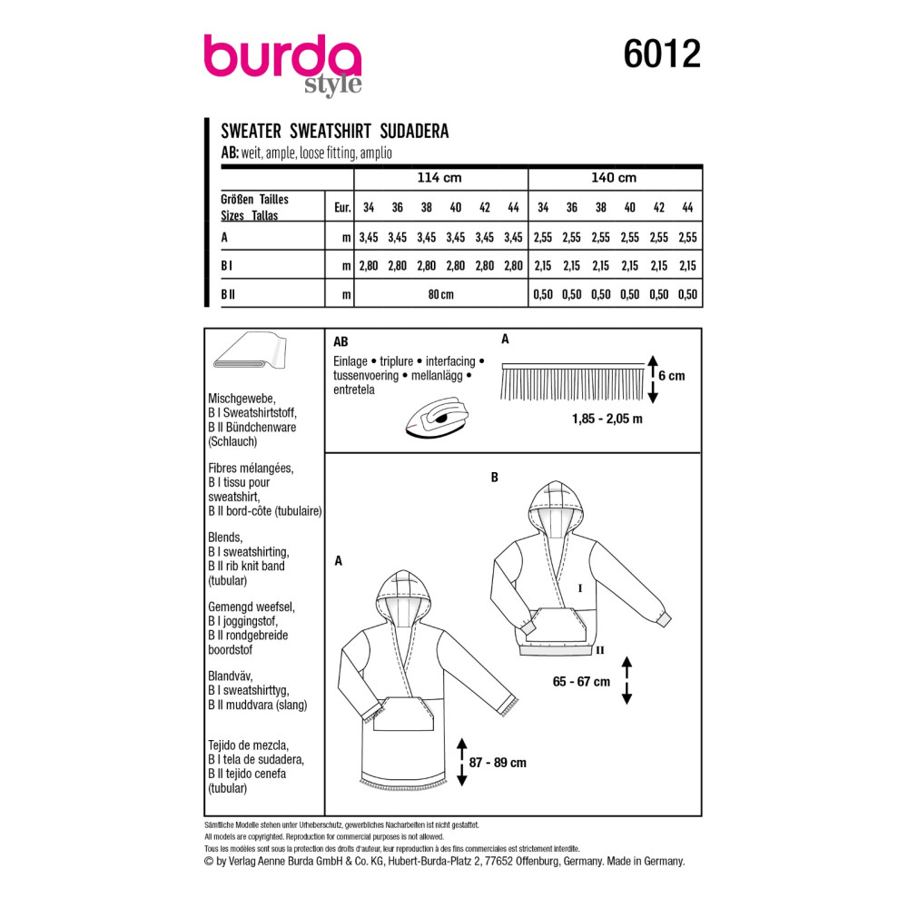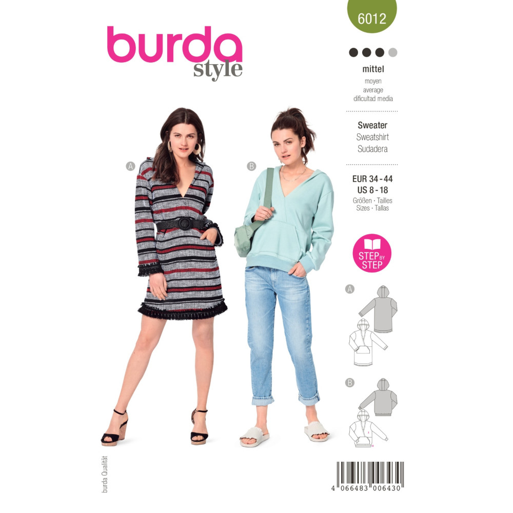 Střih Burda 6012, návod k šití: mikinové šaty, mikina s kapucí