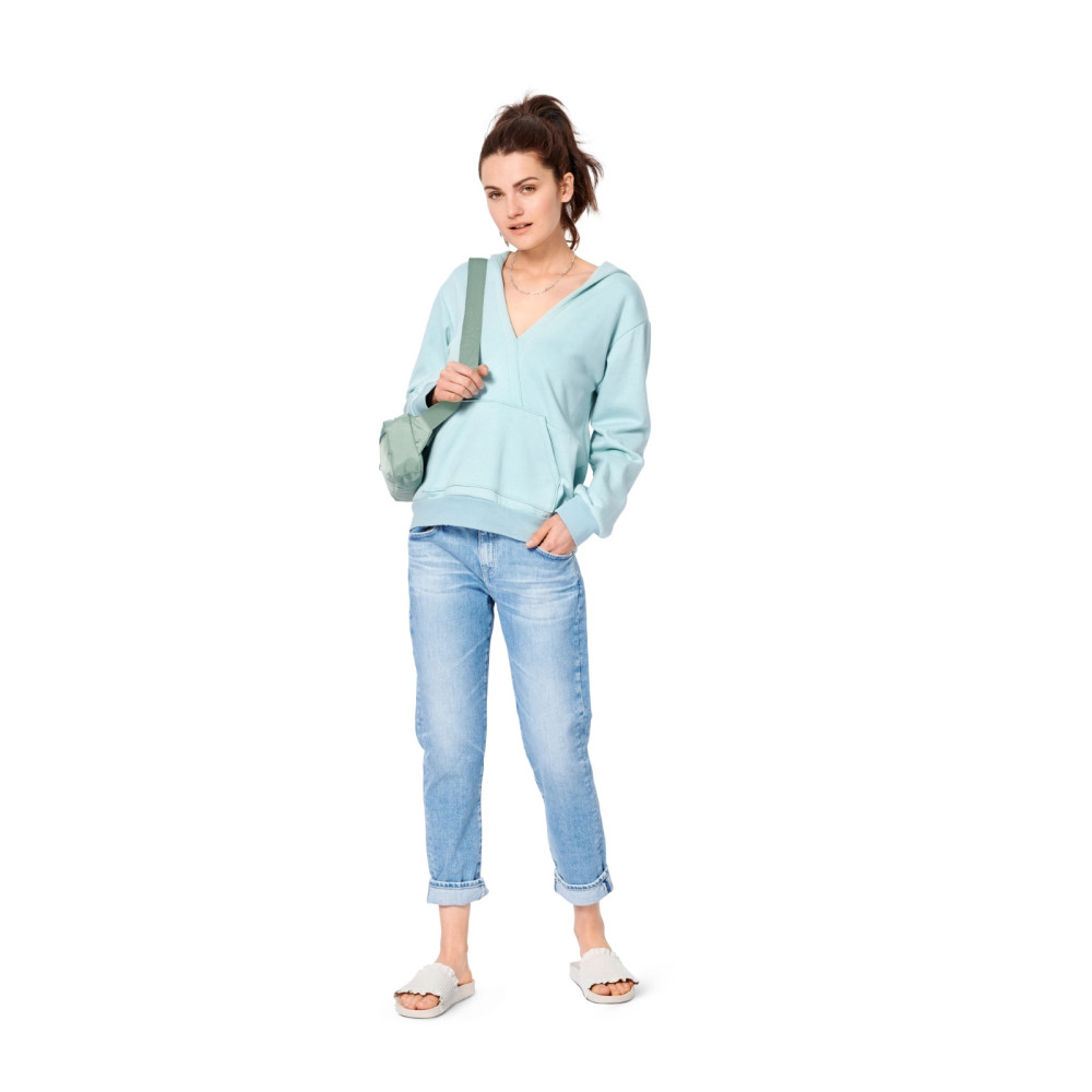 Střih ve velikostech EUR 34-44, úroveň obtížnosti šití: 3 střední info, doporučené látky: směsové látky, teplákovina