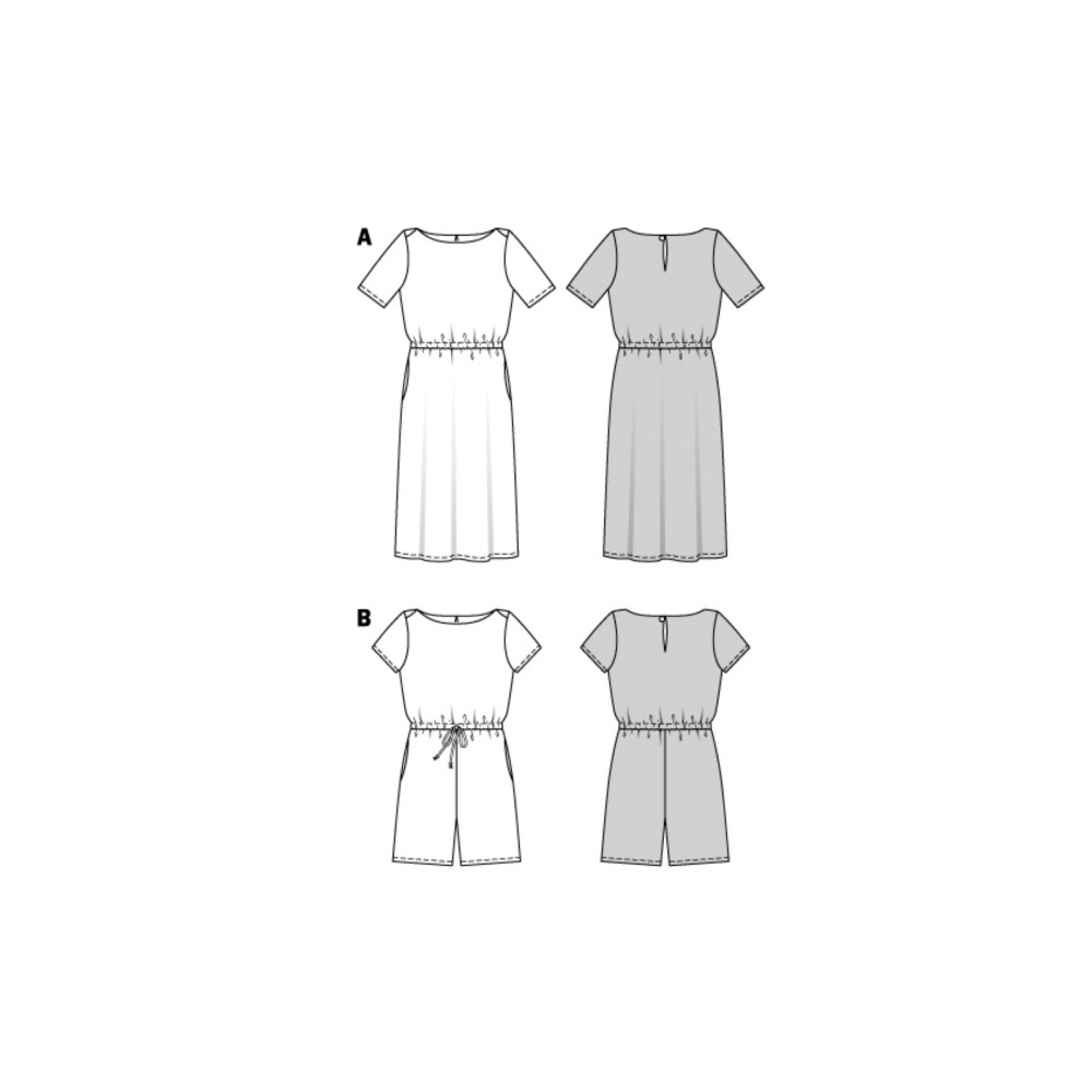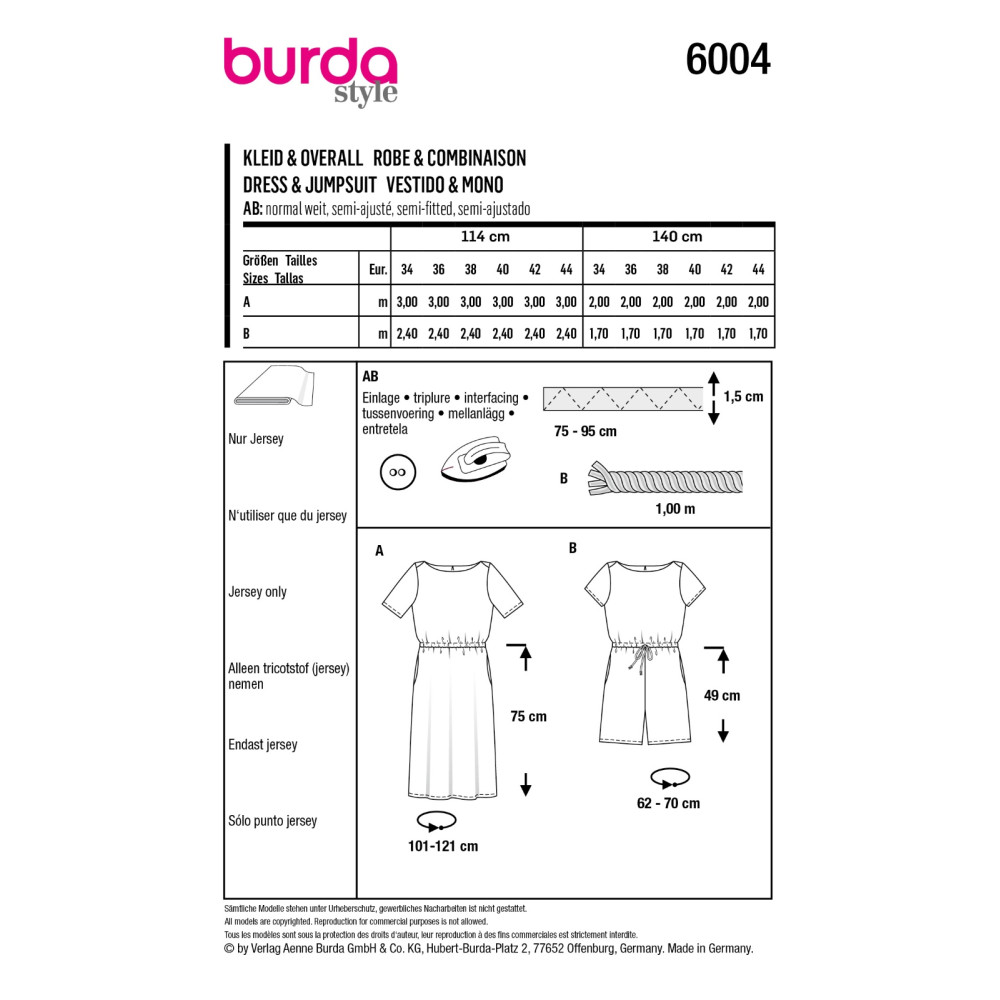 Střih Burda 6004, návod k šití: tričkové šaty s gumou v pase, overal