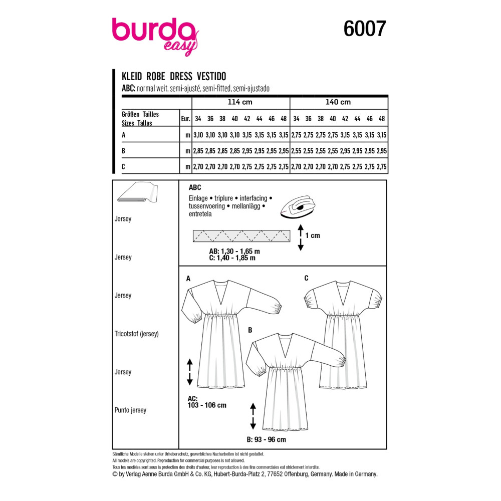 Střih ve velikostech EUR 34-48, úroveň obtížnosti šití: 1 velmi lehká info, doporučené látky: žerzej