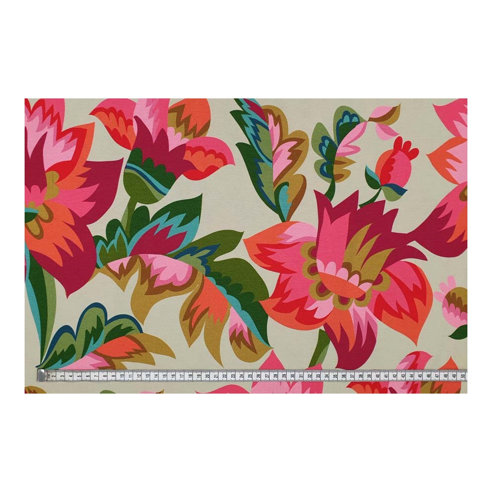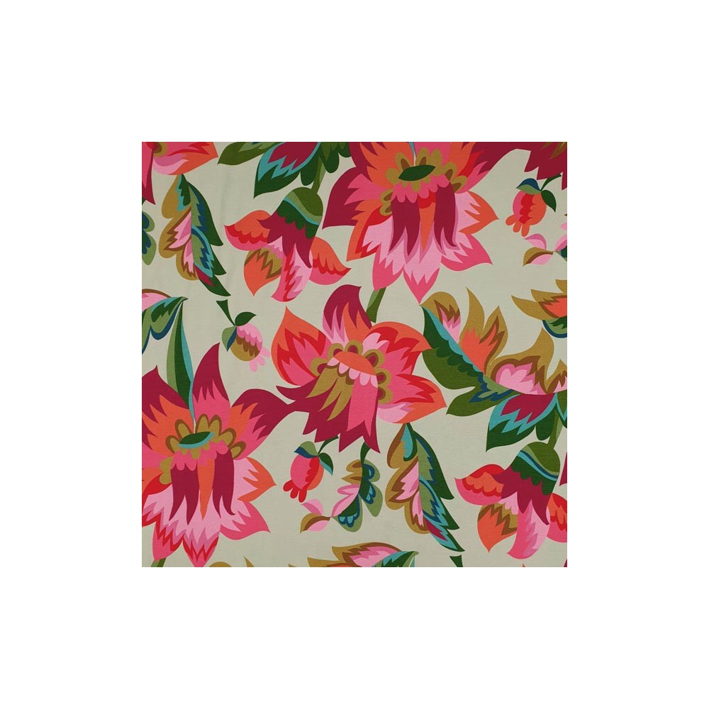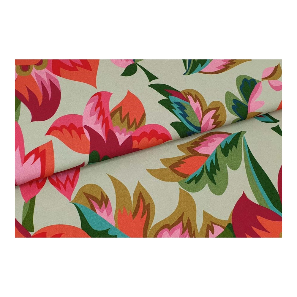 Bílý viskózový úplet prémiové kvality, černé skvrny, červené listy. Pletenina má složení 95% viskóza, 5% elastan. Šířka látky 175 cm. Gramáž 180g/m2. Úplety jsou vhodné na sukně, šaty, halenky, trička, tuniky. Látku je možné s ohledem na vzor (panel) stříhat pouze v násobcích 0,80 m.