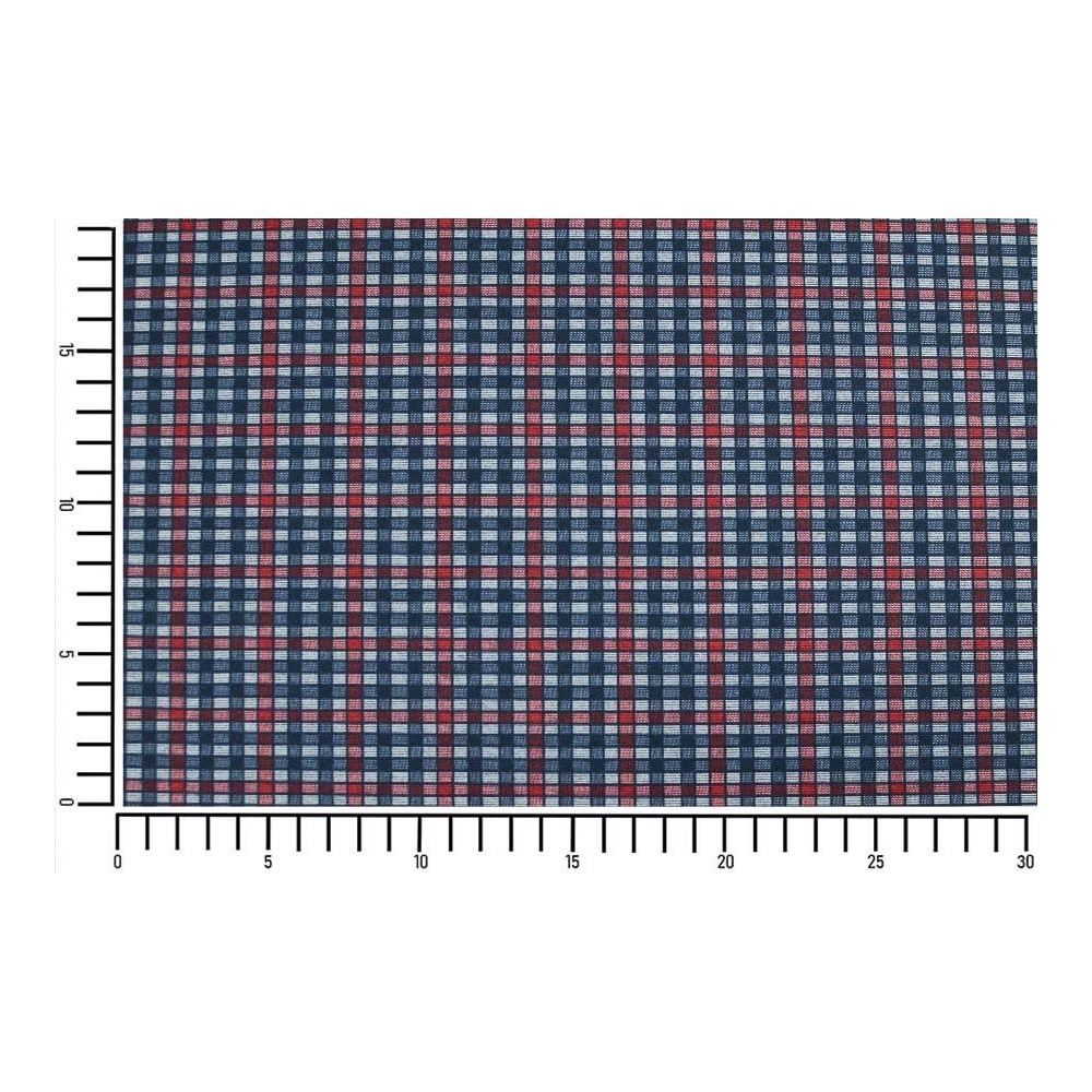 Úplet Punto, modro-zeleno-červené káro. Složení 63% viskóza, 33% polyester, 4% elastan. Šířka látky 150 cm. Gramáž 250 g/m2. Látka se používá na šaty, halenky, sukně. Punto je velice oblíbeným materiálem známých modních návrhářů. Oblečení ušité z úpletu Punto  je příjemným kouskem na omak, pružným, pohodlným při nošení.